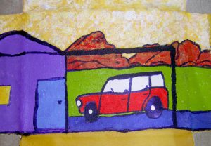 His painting are whimsical and all about the world as he knows it the beautiful country invaded by cars and tourisrs.