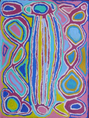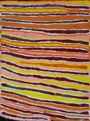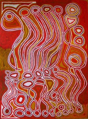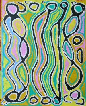 Judy was taught to paint by her older sister Maggie Napangardi Watson. She mostly painted Mina Mina Dreaming stories but some of her totems were Honey Ant, Snake Vine and Hair-string Belt.