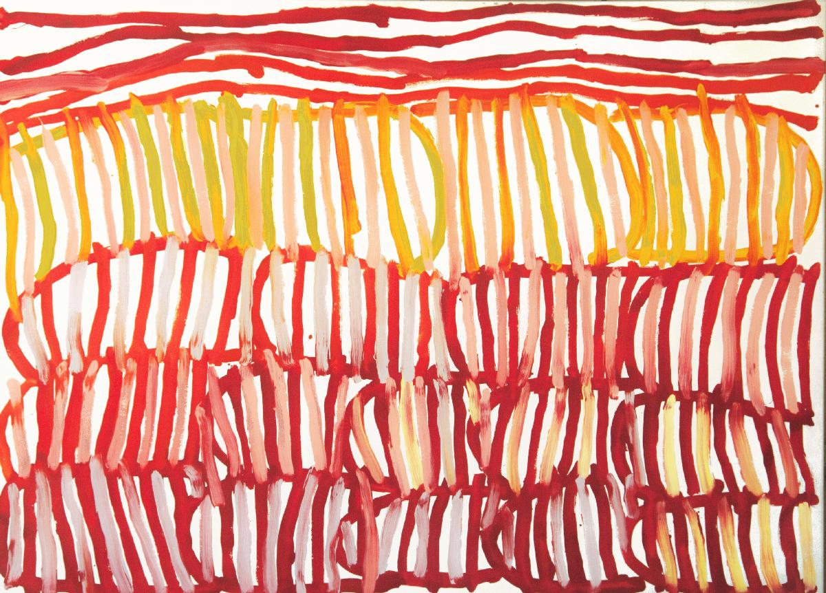 Painted in the year before she died, this magnificent painting displays Minnie’s dedication to culture and spiritual identity through the “Alweye” or ceremonial body painting subject matter. Typical of all the great Aboriginal artists’ works – including those of her illustrious sister-in-law Emily Kame Kngwarreye – the inspiration behind this work is tribal/totemic and spirituality of The Dreaming.