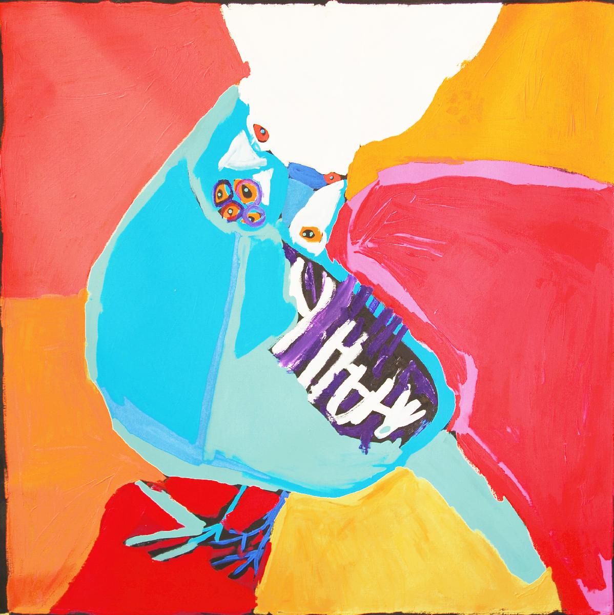 The Jukurrpa site shown in this painting for Ngatijirri (budgerigar [Melopsittacus undulates]) is at Yangarnmpi, south of Yuendumu. ‘Ngatijirri’ are small, bright green birds native to central Australia which are common around the Yuendumu area, especially after the summer rains. Men would hunt for ‘ngatijirri’ nests, robbing them of eggs and juvenile birds, which are both considered delicacies. The men would also go out hunting for adult, flying ‘ngatijirri’, which they would kill by swinging branches, killing sticks or ‘karli’ (boomerangs) to hit the birds in flight. The ‘ngatijirri’ travelled to Yangarnmpi from Patirlirri, near Willowra to the east of Yuendumu and travelled further on to Marngangi, north/west of Mount Dennison and west of Yuendumu. Each time the flock of ancestral ‘ngatijirri’ lands, they perform ceremonies, singing and dancing as they fly and roost in the trees. The sites of these ceremonies are depicted in this painting as concentric circles, while cross-like shapes depict the footprints of the birds on the ground and give an indication of the large flocks of ‘ngatijirri’ that can be found near Yangarnmpi and other sites close to Yuendumu. After good rains ‘ngatijirri’ can successfully breed several times, resulting in an explosion of the population in a short time. Custodians for the Ngatijirri Jukurrpa are Napaljarri/Nungarrayi women and Japaljarri/Jungarrayi men.