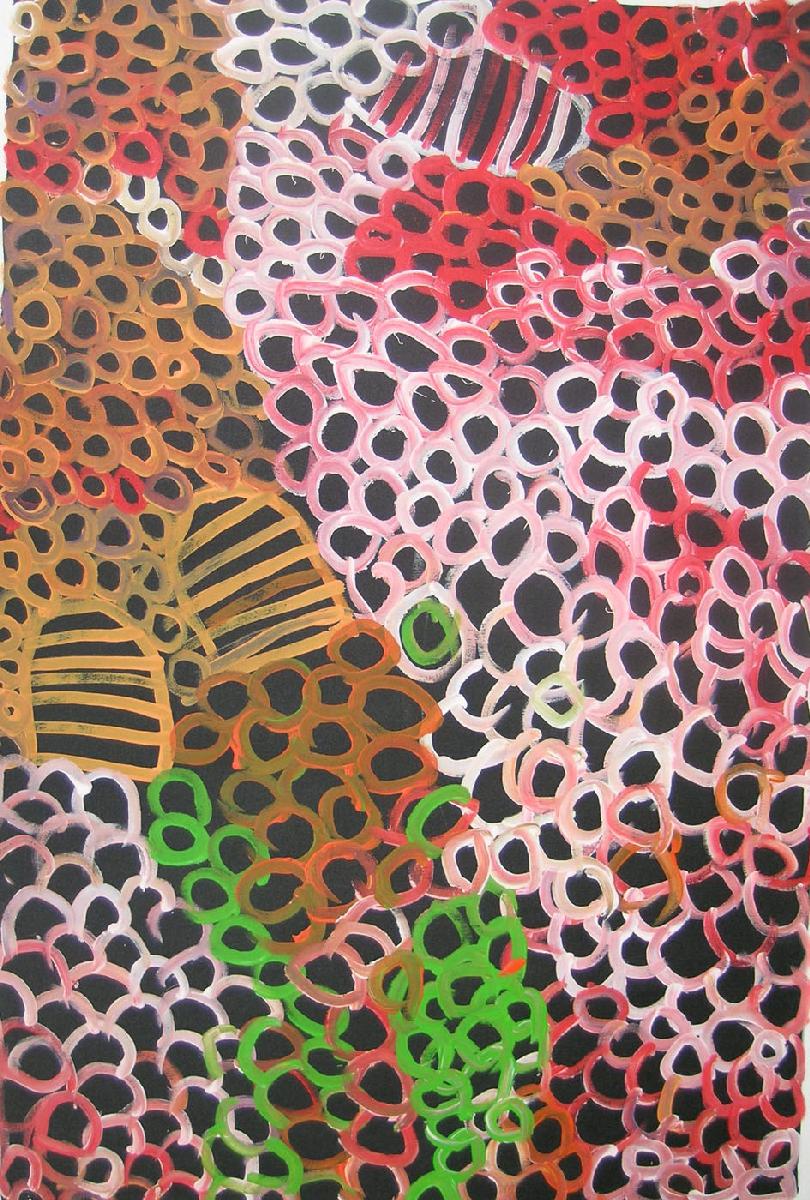 This is a very fine example of Minnie Pwerle’s painting of one of her traditional totems – Bush Melon – especially in context of her identifying the subject in association with sacred ceremony. This is evident in the movement within the painting and the specific inclusion of painted women’s breasts – a common reference shared with her great sister-in-law, Emily Kame Kngwarreye.