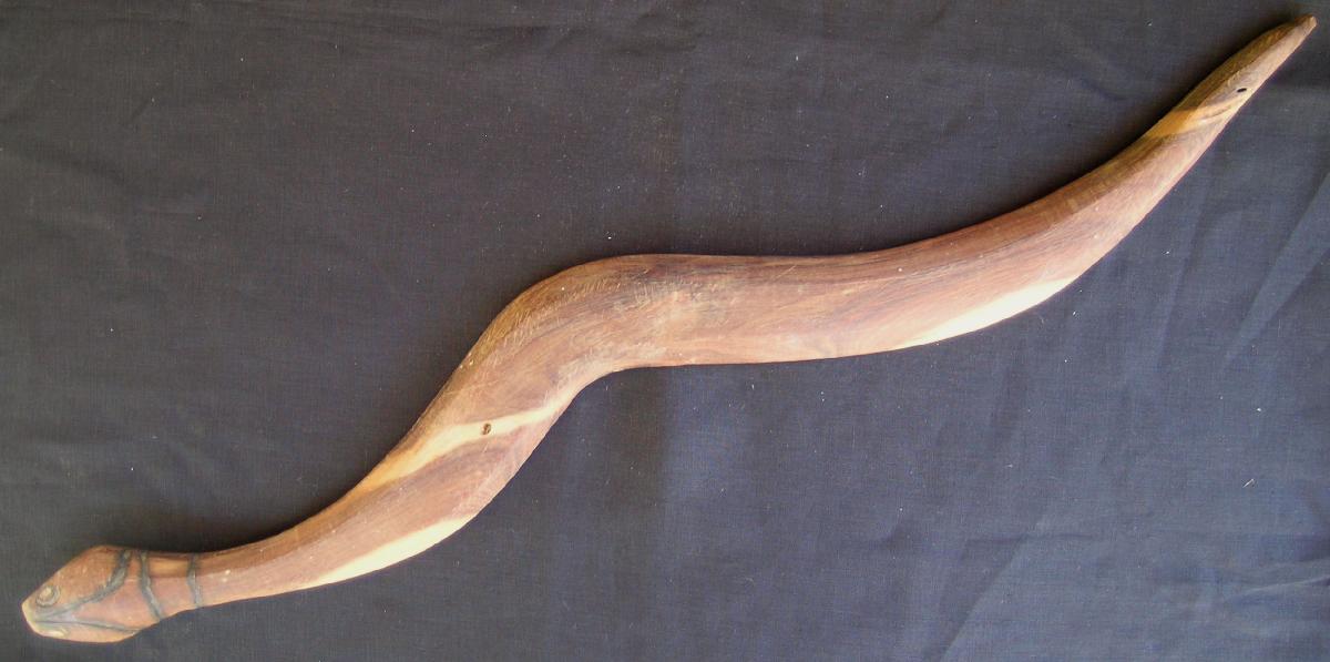 Hardwood snake carved in 1960s in WA Sandy Desert. The head is marked with poker-work.