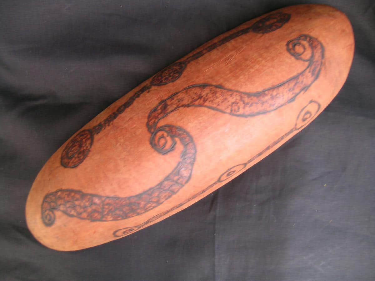 Expertly carved Coolamon from Central Australia with fine edges tapering evenly to a consistent density at the middle. Totemic design using south western South Australian hotwiring techniques. Carved for community and shows evidence of usage but otherwise in excellent condition. Provenace: Tony Bond, South Australia