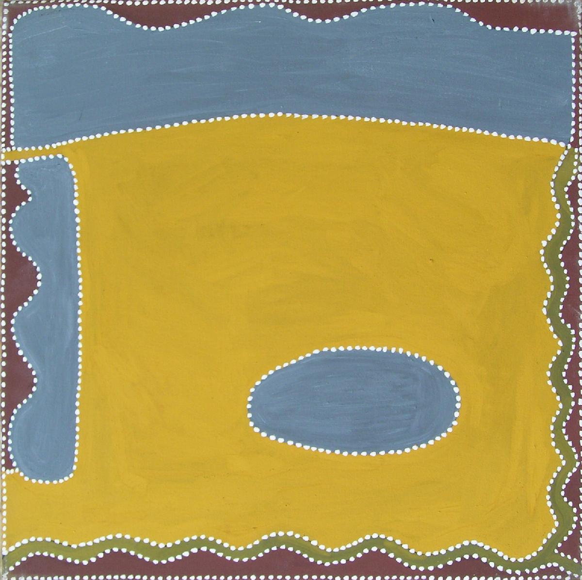 Minnie is painting the country where she was born and where her name originated. It is traditional country called Bubble Community in Dumbaral located east of Newry Station in the Kimberley. “This is part of my country and the natural fresh water spring which bubbkes up called “Lumai, Lumai” is where I got my name.”