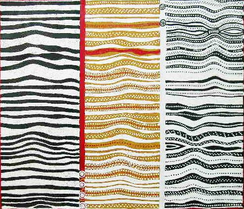 This painting relates to a place close to Yuendumu and associated with secret mens ceremonial activity and therefore no further information is available. On another level, there are stories of women travelling htrough the country collecting bush food.