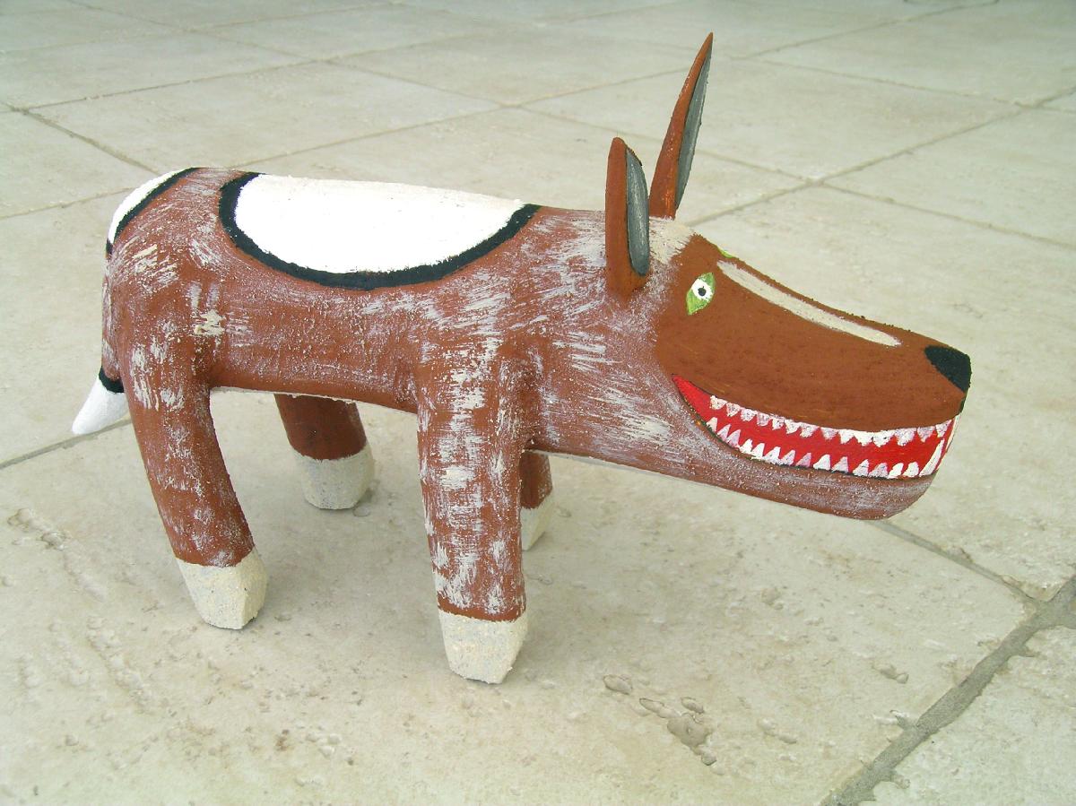 Contemporary Aurukun carvings of their camp dogs (Ku – which is also the Wik word for dingo) have become immensly popular and this is a beautiful example using ochres, clay and charcoal with acrylic.