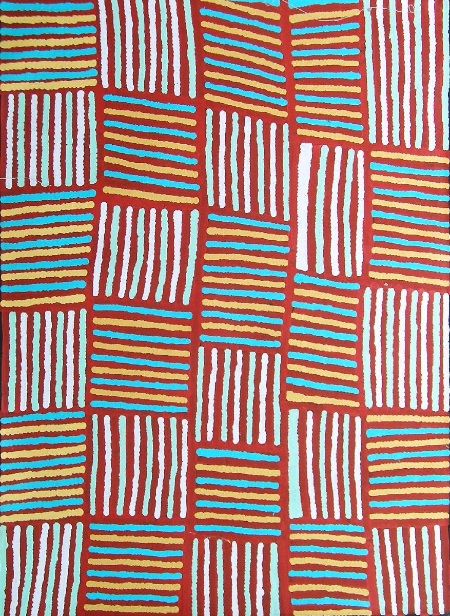 Lake Hopkins is a salt lake north of the community of Tjukurla where women for ceremony. The painting describes journeys travelled by ancestors