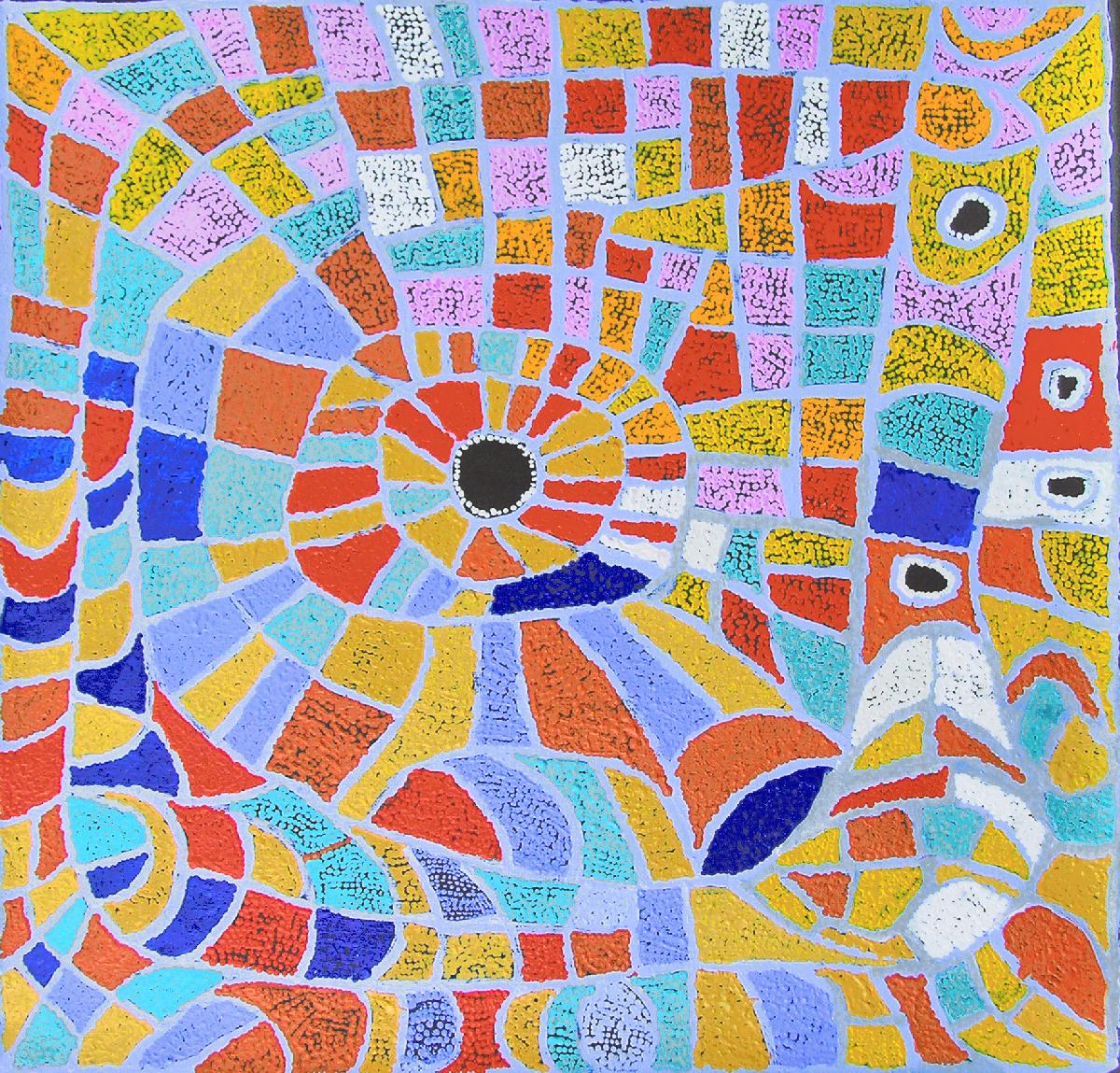 This ‘Jukurrpa’ (Dreaming) comes from Mina Mina, a very important women’s Dreaming site far to the west of Yuendumu near Lake Mackay and the WA border. The ‘kirda’ (owners) of this Dreaming are Napangardi/Napanangka women and Japangardi/Japanangka men; the area is sacred to Napangardi and Napanangka women. There are a number of ‘mulju’ (water soakages) and a ‘maluri’ (clay pan) at Mina Mina.