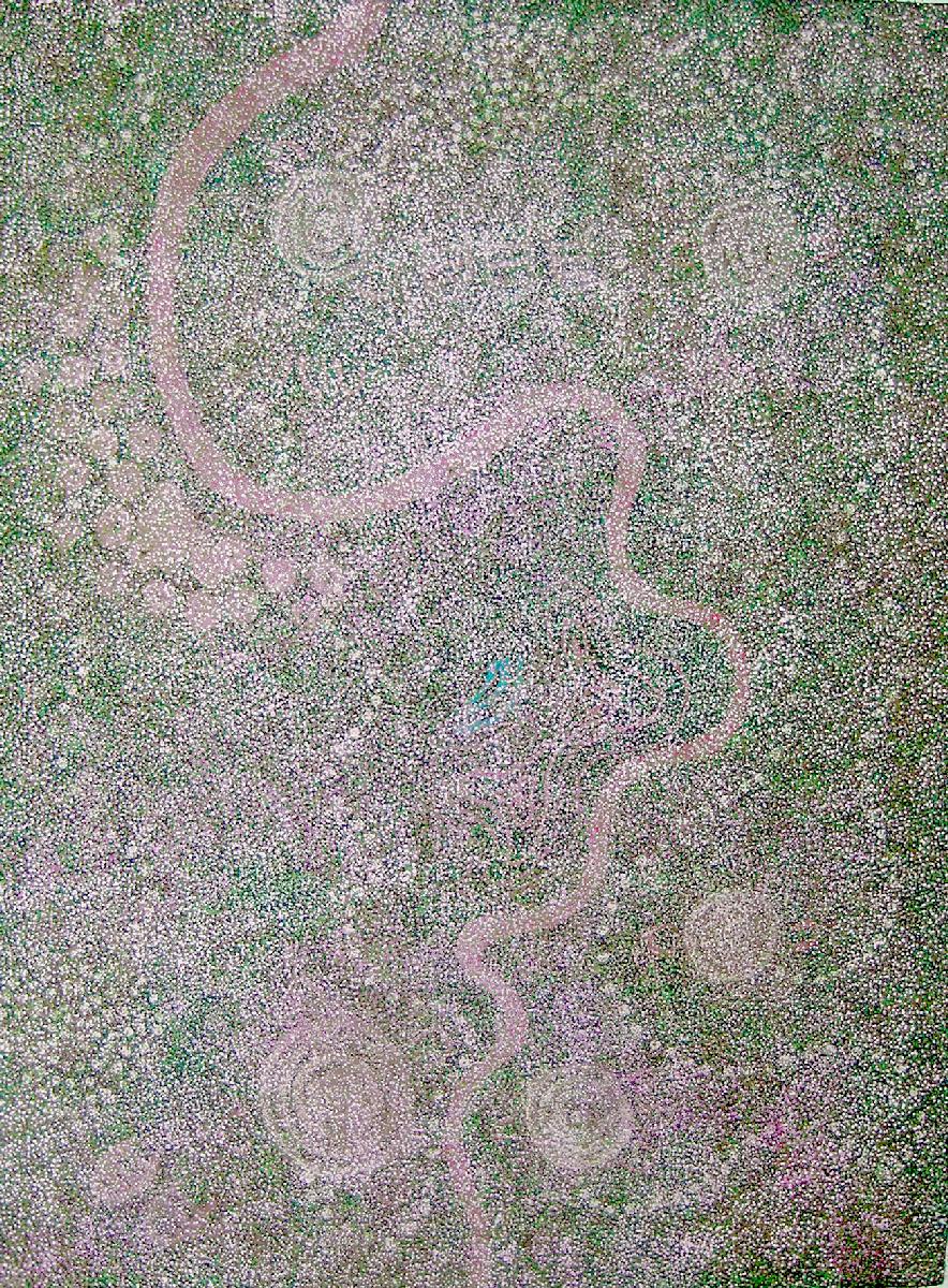 The painting style of this magnificent work, namely very fine dotting combined with the suggestion of underpainting associated with Secret Womens Business reflects traditional sand painting designed for sacred ceremony.