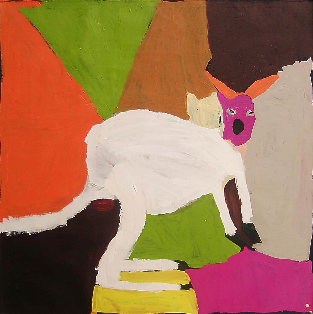 This painting depicts the Marlu Jukurrpa – Red Kangaroo. Kanfgaroo are a highly valued food source by the Warlpiri people of the westwen deserts.The story in this painting is of an old Ancestral kangaroo named Warlawee who made his camp at Jurnti moving about, hunting during the day and returning to the camp at night. The camp consists of depressions dug in the soft ground. He traveled long distances looking for his preferred food, yukuri which is fresh green growth foung under Mulga trees. He thinks about having a ceremony for men. Wopmen are not permitted to dance at this ceremony.