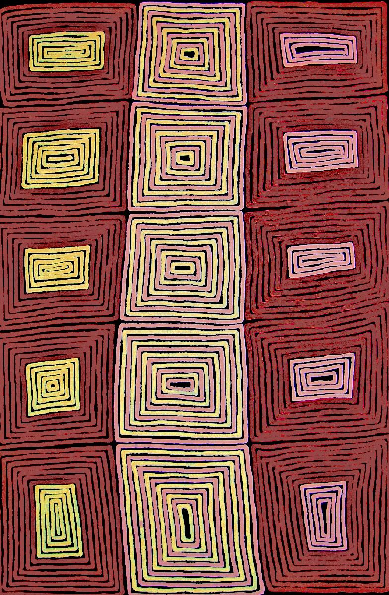 This painting is a fine example of his influence as one of Papunya Tula’s major artists and is representative of his “pioneering, bold, scaled-up and linear style” (a) from the 1990’s that gained international attention. Its origins lie in dot painting that involves the repetition of a loaded brush pulled linearly on the canvas to form his desired motifs, in this case geometric,