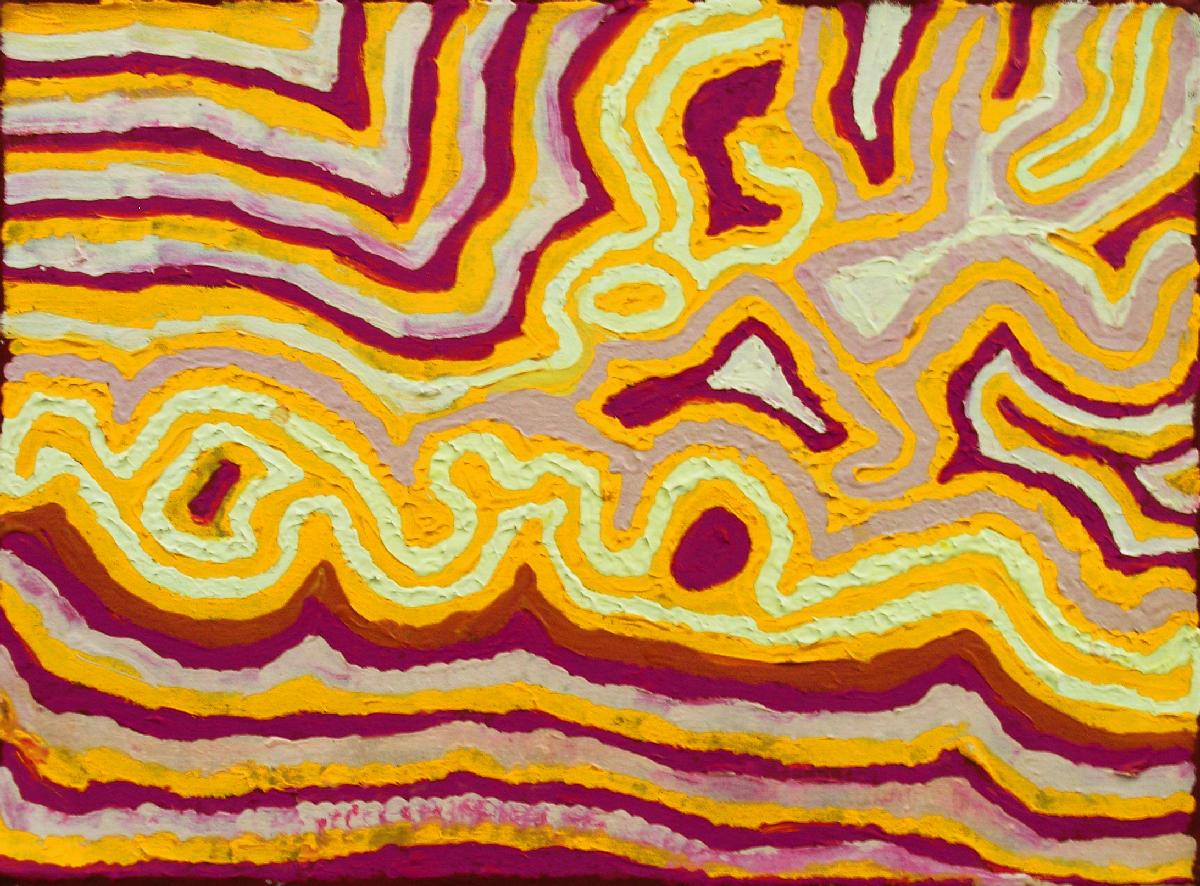 Ningi has painted the country south of Balgo in the Great Sandy Desert. There are soakwaters as well as fresh water, This is the land of Ningi’s youth where she hunted as a young woman.