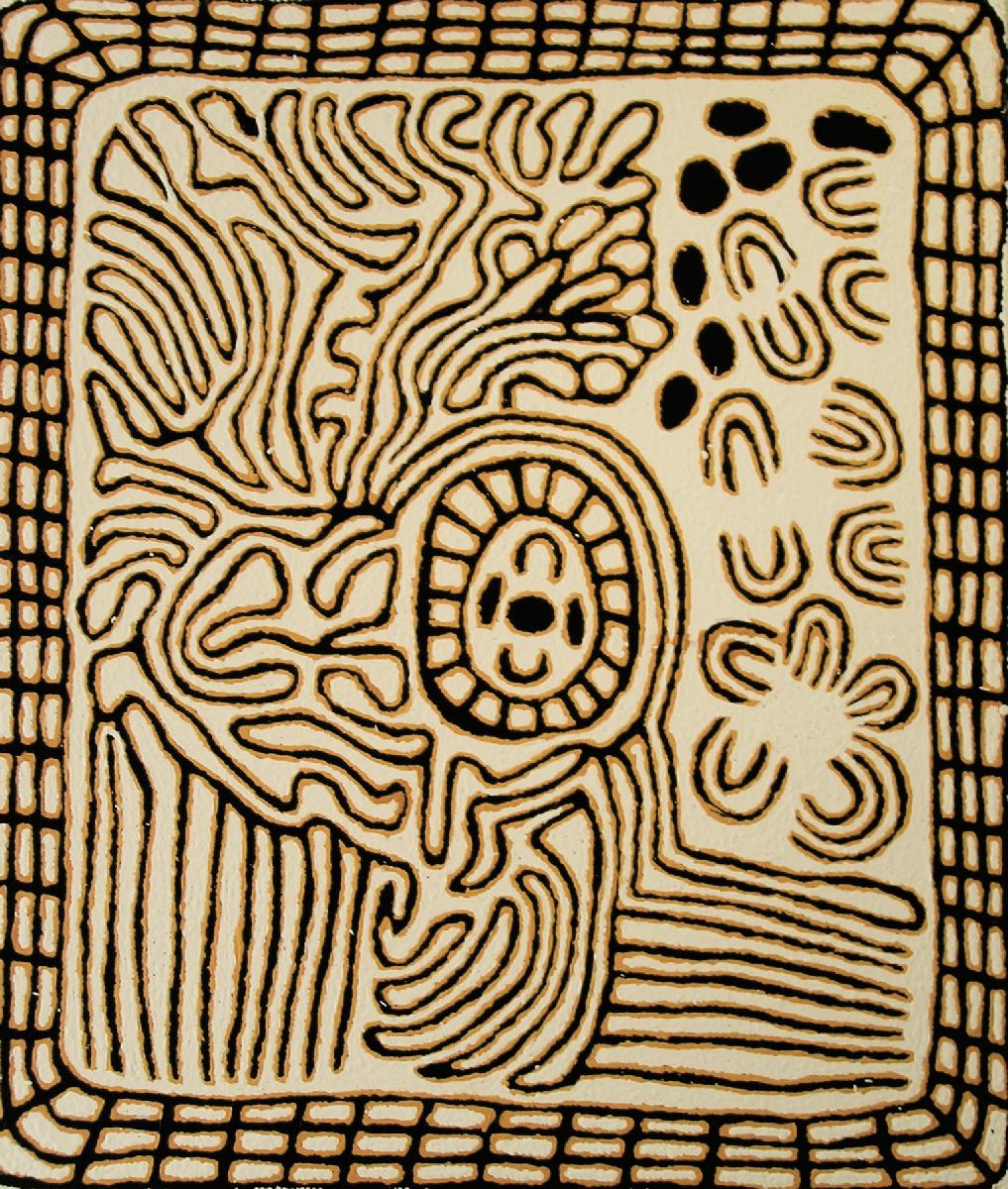Painted in part using the drag-dotting style on black and the clever use of orange/ochre bordering a creamy ground makes the painting shimmer as if it is in the desert.