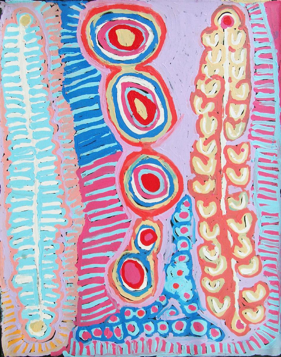 This Dreaming story relates to the country adjacent to the windmill at Warlarlarla (Rabbits Flat). It tells of two dog Ancestorsnwho tyravelled along a creek bed. The ribcages of the Jampijinpa and Napangardi and their family can be seen in the landscape as depicted in this painting. There are also several waterholes.