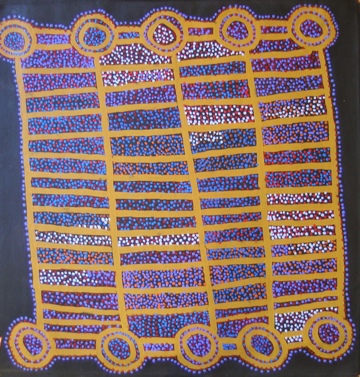 The site of this painting is Puyurru west of Yuendumu. In the usually dry creek beds are water soakages or naturally occuring wells. The water dreaming story Shorty tells is of two Jangala ancestors who sang up rain which consequently created a fierce storm.