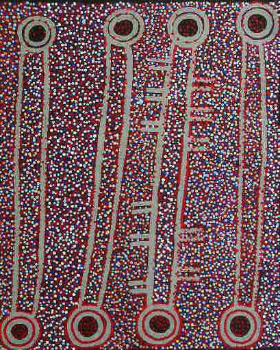 The site of this painting is Puyurru west of Yuendumu. In the usually dry creek beds are water soakages or naturally occuring wells. The water dreaming story Shorty tells is of two Jangala ancestors who sang up rain which consequently created a fierce storm which inturn shaped the hills and country where he was born.