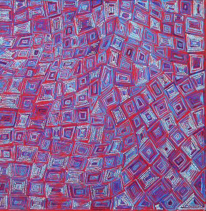 The site of this painting is Puyurru west of Yuendumu. In the usually dry creek beds are water soakages or naturally occuring wells. The water dreaming story Shorty tells is of two Jangala ancestors who sang up rain which consequently created a fierce storm. This storm collided with another storm and was carried by a brown falcon. However the storm became too heave for the falcon who dropped it at Parlinyarnu where it became a claypan or soak. To this day when it rains, hundreds of ‘bush ducks’ come to the area.